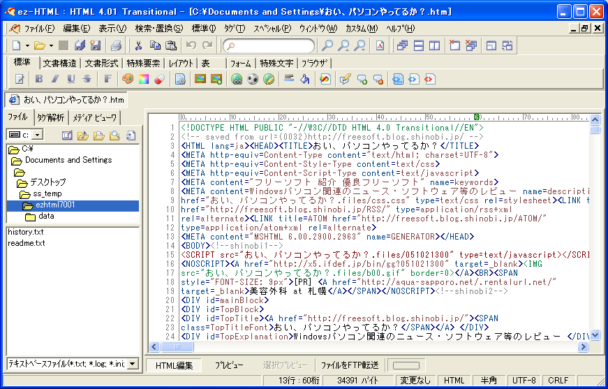 HTMLに特化した高機能エディタです。ブログでテンプレートのHTMLタグ改変や、プラグインのHTML編集などに役立ちます。あくまでもHTMLを熟知したユーザー向けのソフトウェアですが、初心者の方でも参考書などさえあれば割と使えると思います。また画面デザインも見やすく、操作も容易です。